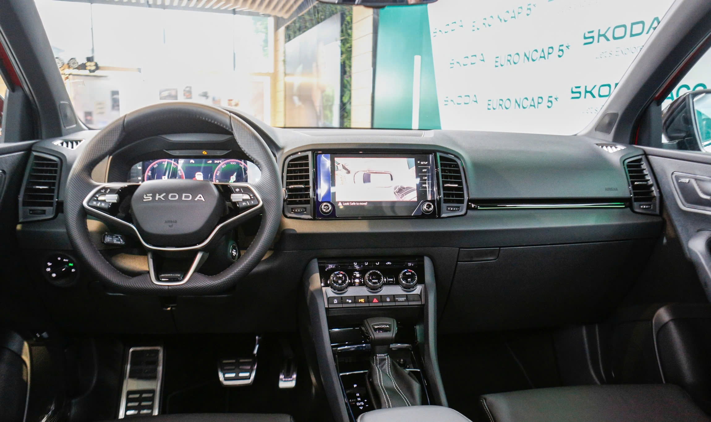 Bên trong, nội thất Skoda Karoq mang phong cách tối giản nhưng đẳng cấp. Khoang cabin rộng rãi, ghế ngồi bọc da cao cấp, vô-lăng 3 chấu thể thao cùng cụm đồng hồ kỹ thuật số hiện đại. Màn hình giải trí trung tâm cảm ứng 8–10 inch hỗ trợ kết nối Apple CarPlay và Android Auto, hệ thống âm thanh chất lượng cao cùng điều hòa 2 vùng độc lập mang lại trải nghiệm thoải mái cho mọi hành khách.