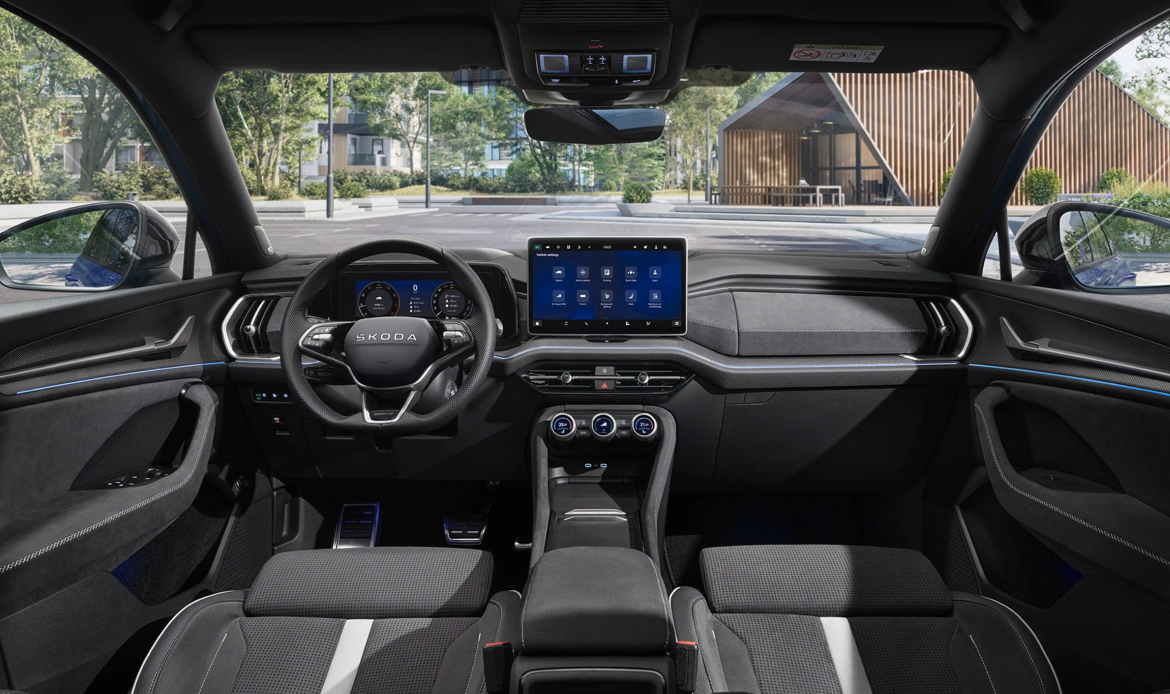 Bước vào khoang nội thất, Skoda Kodiaq mang đến không gian rộng rãi, tinh tế với cấu hình 5+2 chỗ ngồi linh hoạt. Ghế da cao cấp, hàng ghế thứ hai trượt và ngả linh hoạt, hàng ghế thứ ba gập phẳng giúp tối ưu không gian chứa đồ khi cần thiết. Màn hình giải trí trung tâm cảm ứng 10 inch hỗ trợ Apple CarPlay, Android Auto cùng cụm đồng hồ kỹ thuật số 10,25 inch mang lại cảm giác hiện đại, công nghệ.